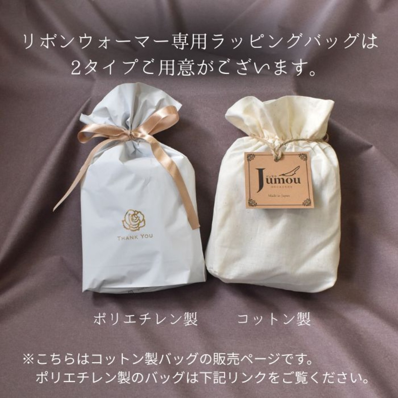 お手軽なポリエチレン製、サテンのリボンで口を閉じるタイプと、