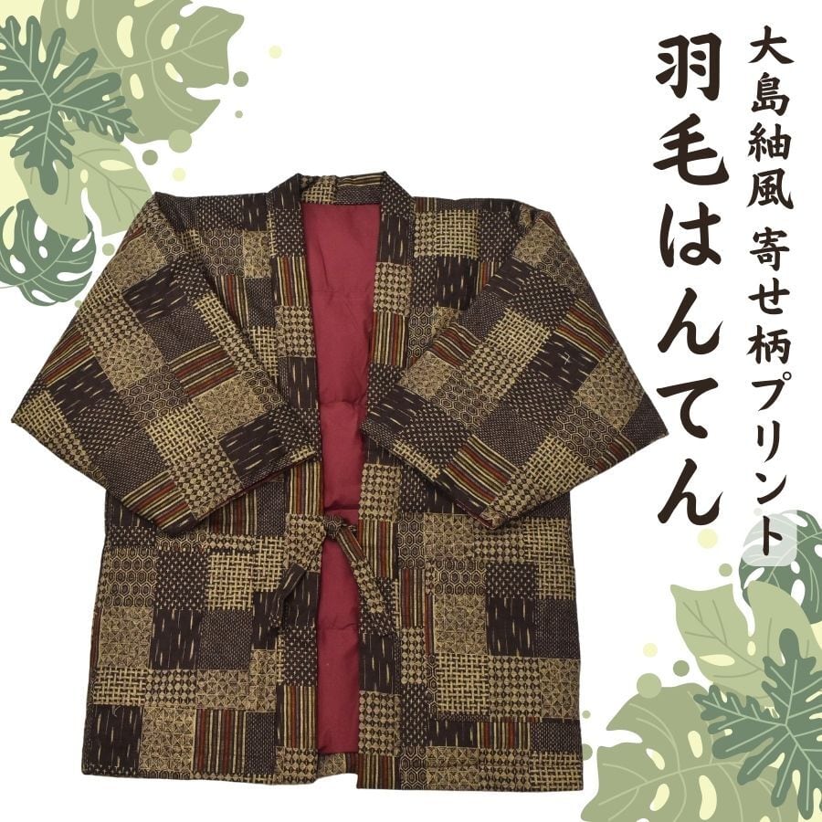 大島紬風寄せ柄プリントの羽毛はんてん|Down Hanten with Oshima-style Patchwork Print