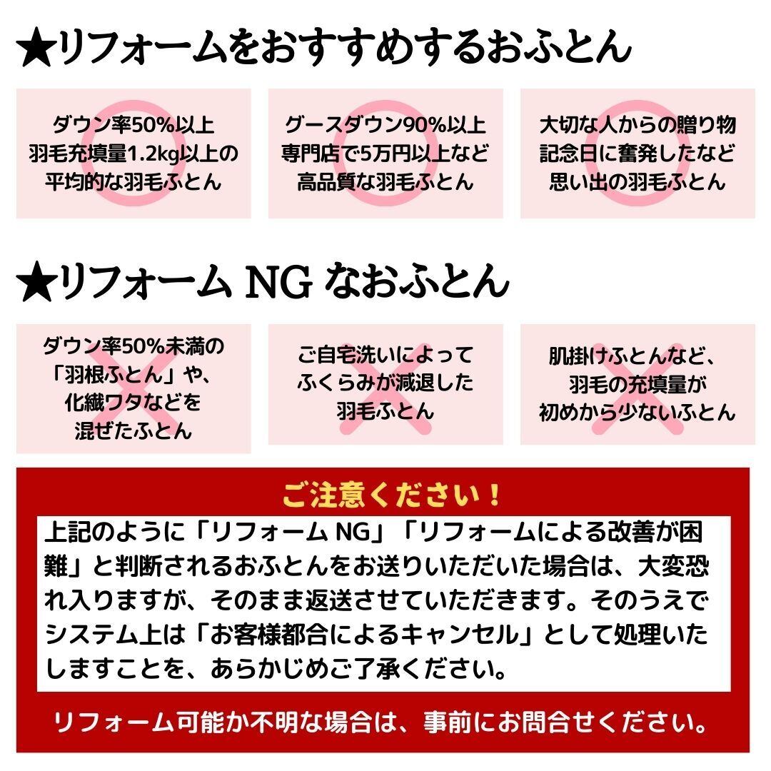 **ダウン率50%以上の「羽毛布団」**のみお受けしております。