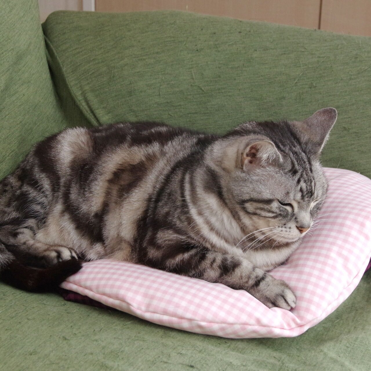飼い主さんの悩みから生まれた、羽毛入ったネコ型座布団です。